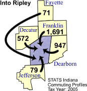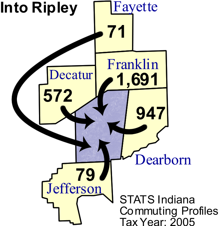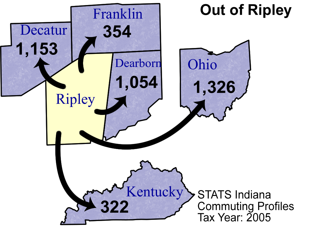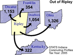 | County name | Commute INTO Ripley County | % of Ripley County Work Force | Commute FROM Ripley County To: |