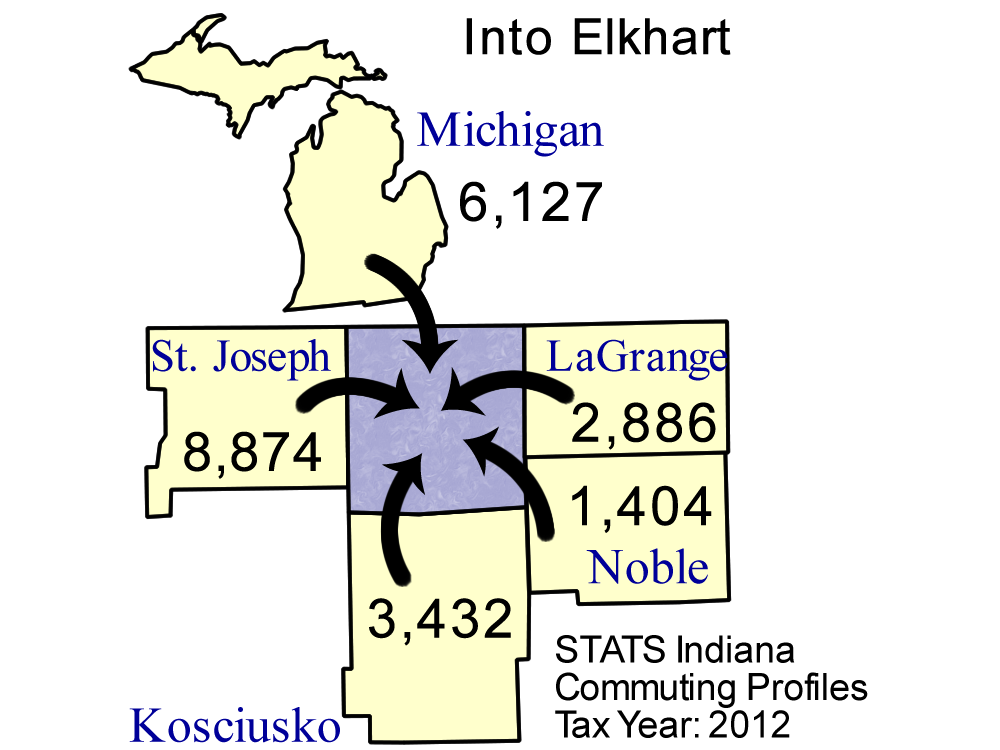 | County Name | Commute INTO Elkhart County | % of Elkhart County Workforce |